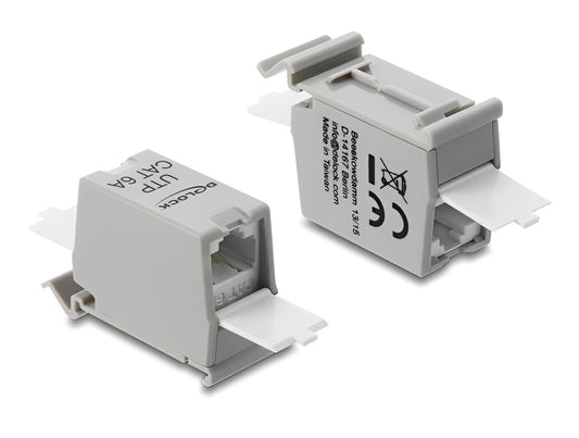מתאם Delock לא מסוכך RJ45 Cat.6A נקבה לנקבה עם כיסוי אבק | להרכבה על מסילת DIN