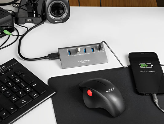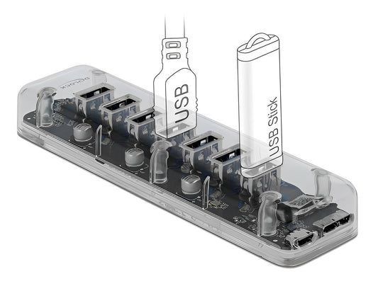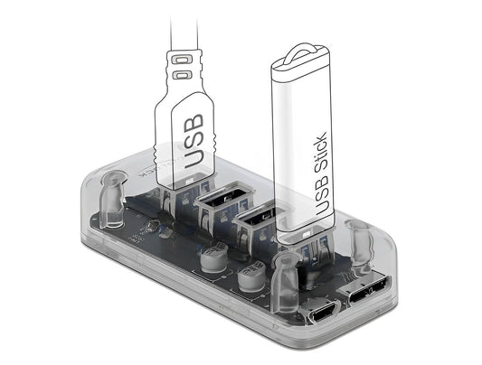 מפצל שקוף Delock USB 5Gbps עם 4 יציאות USB-A | חיבור למחשב USB-A/C