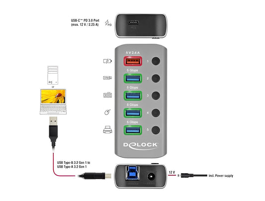 מפצל אקטיבי Delock USB 5Gbps עם 7 יציאות USB-A ומפסקים | חיבור למחשב USB-A