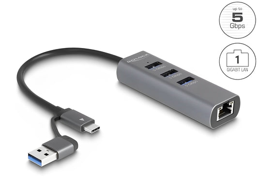 מפצל Delock 5Gbps עם 3 יציאות USB-A + יציאת רשת Gigabit LAN | חיבור למחשב USB-A/C