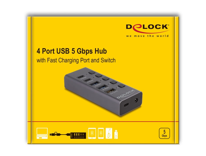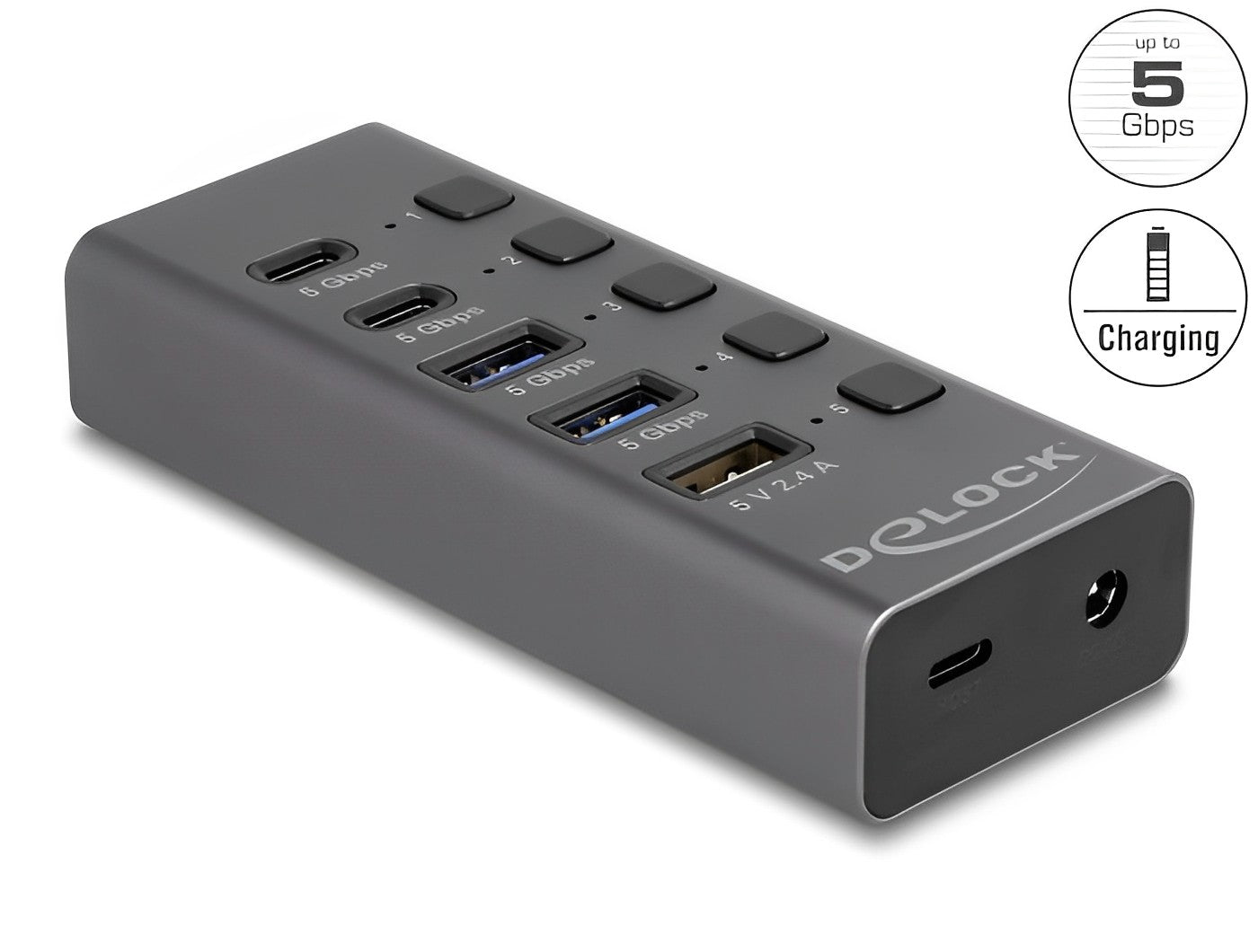 Delock USB 5 Gbps Hub with 2 x USB Type-A and 2 x USB Type-C™ female and 1 x Fast Charging Port + Switch