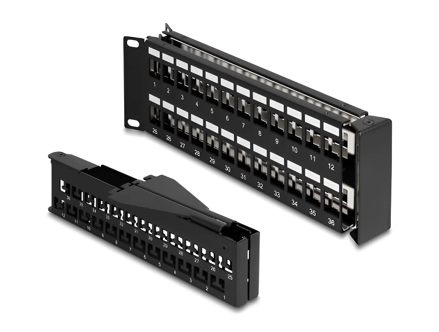 Delock 19″ Keystone Patch Panel 48 port with strain relief 2U angled black