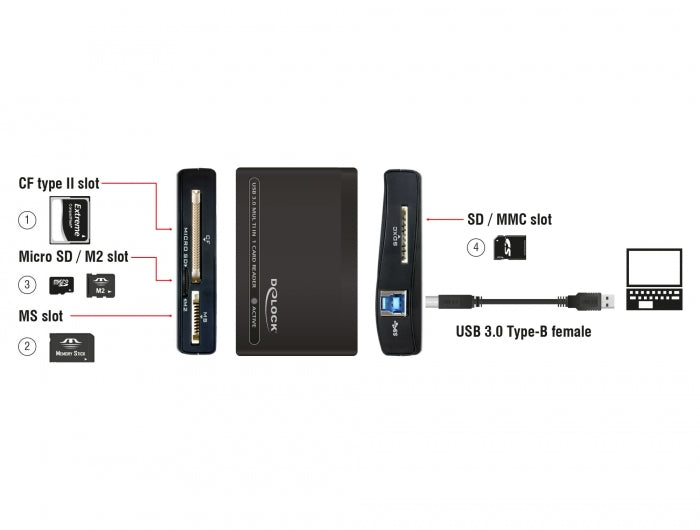 קורא כרטיסים אוניברסלי USB 3.0 יצרן DELOCK גרמניה מאפשר לקרוא ולכתוב כרטיסי זיכרון מסוגים שונים. ניתן לחבר את קורא הכרטיסים למחשב עם כניסה USB Type-A.
