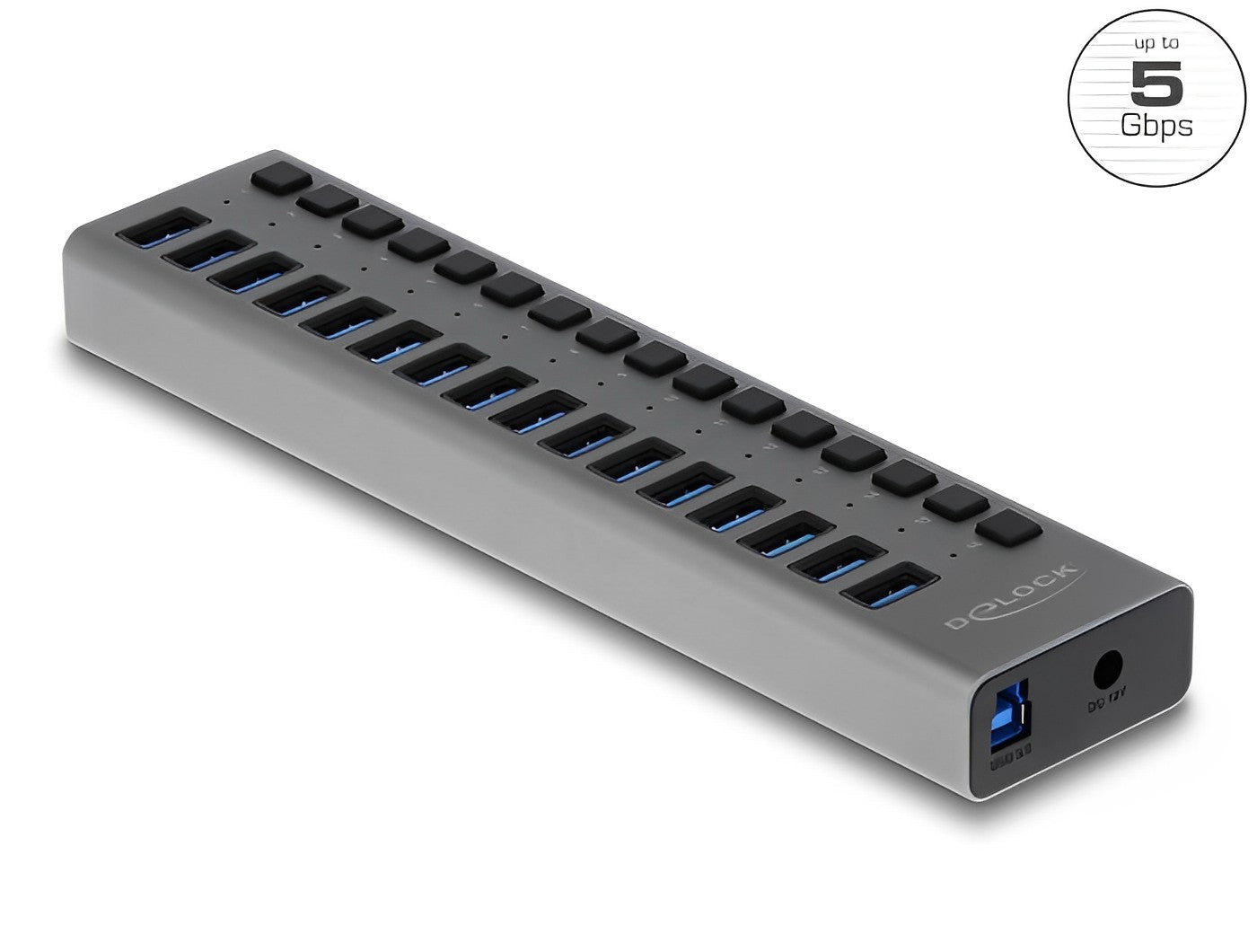 מפצל אקטיבי Delock USB 5Gbps עם 16 יציאות USB-A ומפסקים | חיבור למחשב USB-A