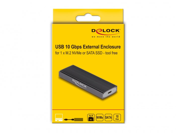 מארז חיצוני מבית Delock גרמניה מאפשר התקנה של כונן SSD מסוג M.2 PCIe NVMe או SATA בפורמטים 2280, 2260, 2242 ו-2230.