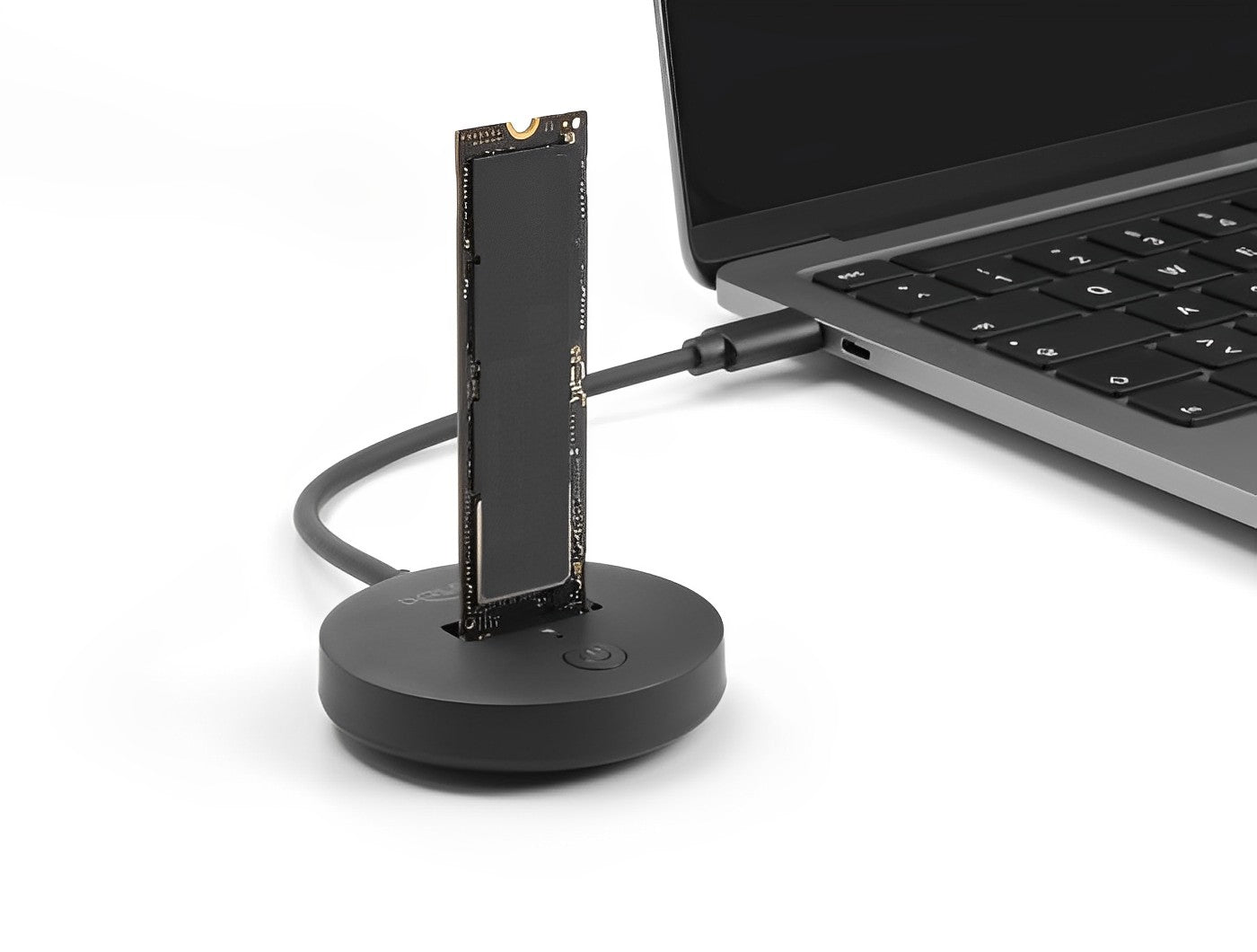 תחנת עגינה M.2 מבית Delock גרמניה מאפשרת התקנה קלה של כונן SSD מסוג M.2 PCIe NVMe או M.2 SATA, וחיבור מהיר למחשב או ללפטופ דרך USB-C.