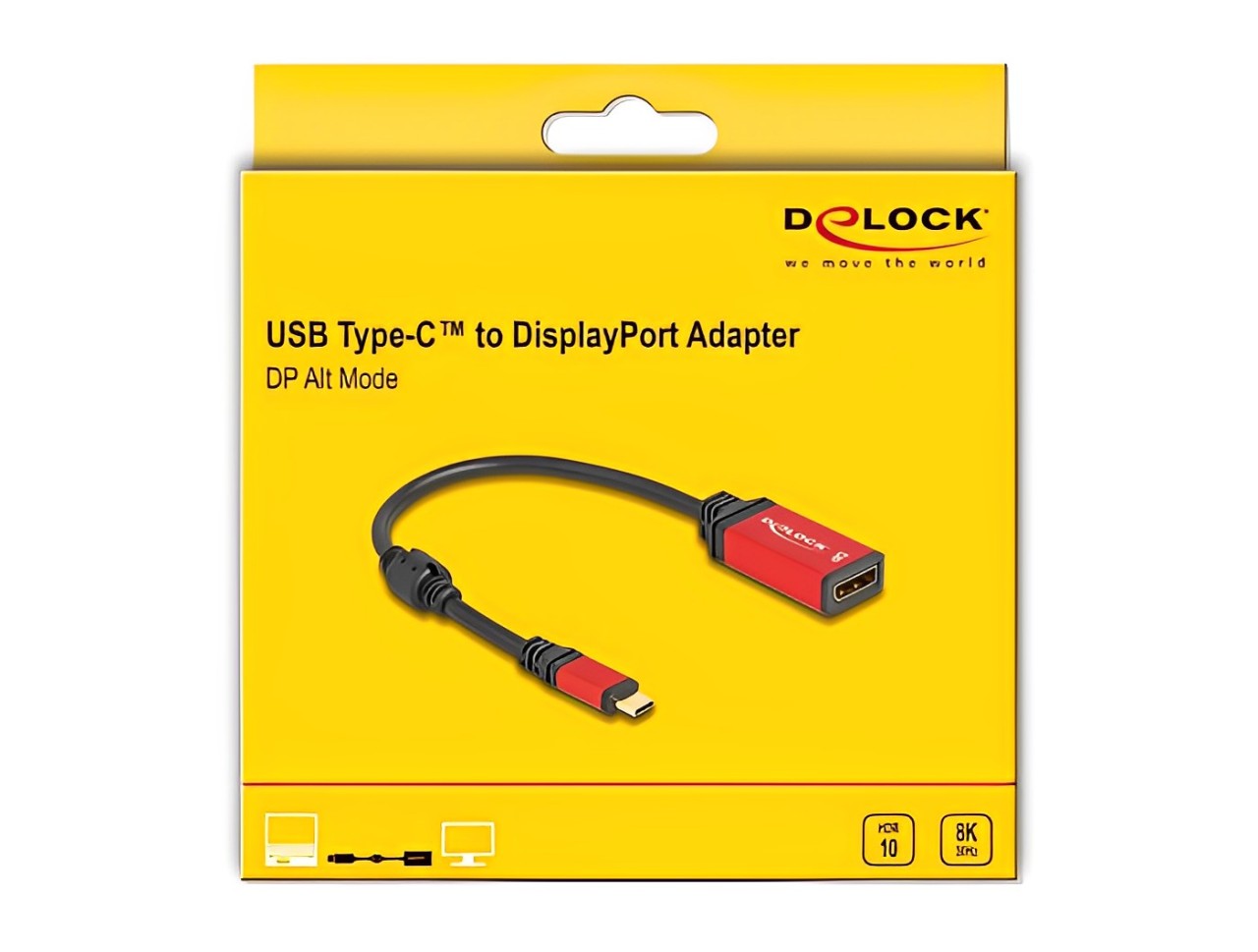 מתאם תצוגה Delock Red metal מחיבור USB-C זכר לחיבור DisplayPort 8K 30 Hz נקבה | תומך HDR
